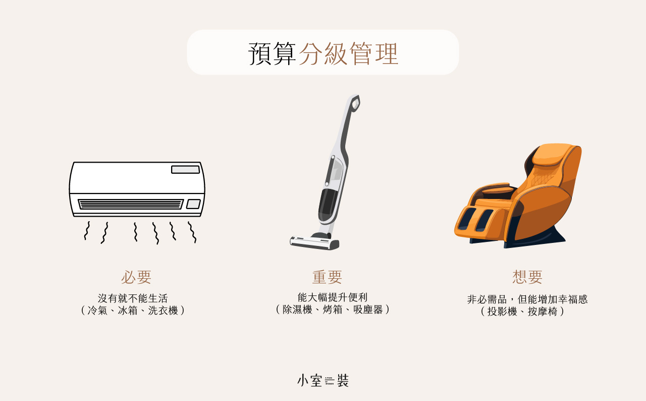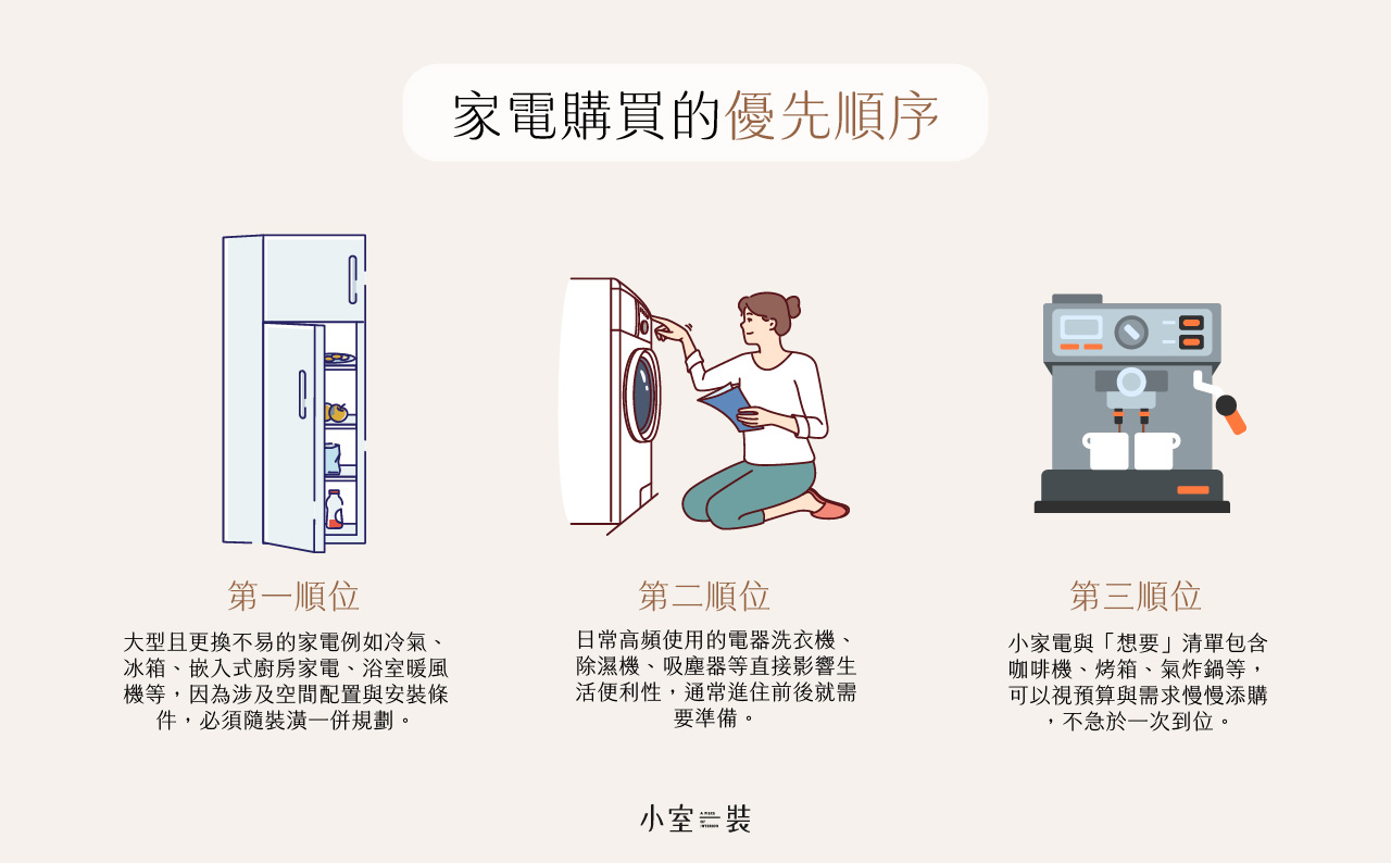 •第三順位:小家電與「想要」清單包含咖啡機、烤箱、氣炸鍋等,可以視預算與需求慢慢添購,不急於一次到位。