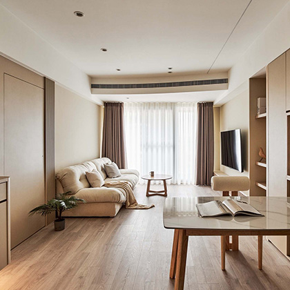 弧形天花與大面石紋主牆構築柔中帶剛的空間韻律灰白色系鋪陳主調佐以木質調的溫潤平衡